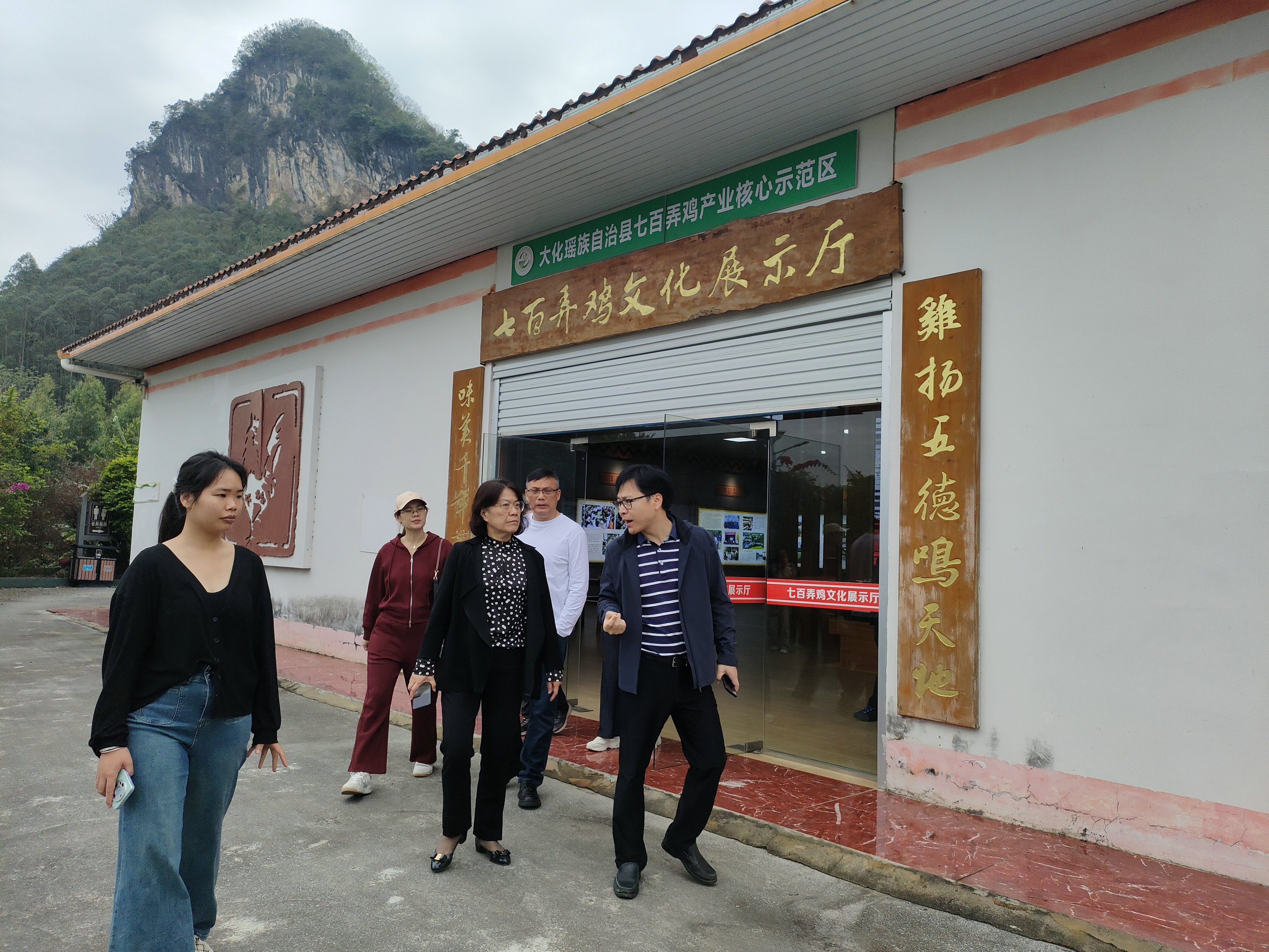 大化县委常委、副县长黎力(右一)向南边日报调研组先容七百弄鸡。
