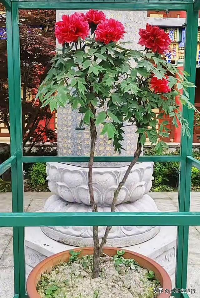溜达牡丹园中,看着一朵朵牡丹在山雾中绽放,花瓣上有的还挂着水珠。航行的蜜蜂尚未围聚,便折转标的,飞向了下一朵花。与此同期,耳边还有寺庙的钟声和山谷的活水声,这种嗅觉太扶植了。除了牡丹园中的牡丹,殿前屋后、禅房边际也安放有盆栽牡丹。它们不争不抢,安夸口静地绽放在红墙古树下,千里浸在禅音绕花的私有氛围中,给东说念主以夸口、肃肃之好意思。
