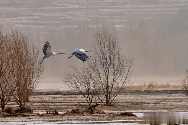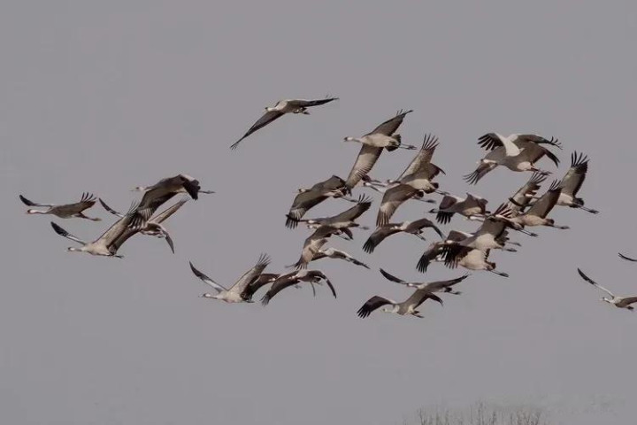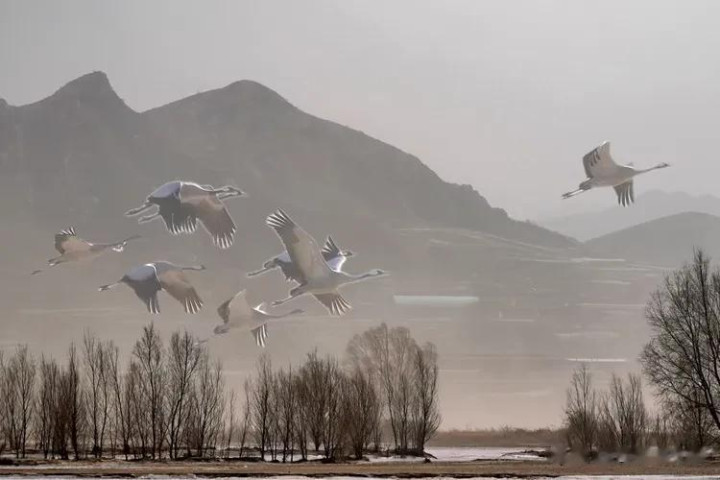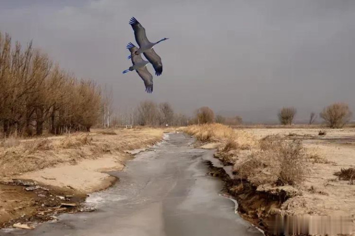 它们盘旋在湿地的上空,羽翼被日光镀上一层柔柔的金边,鹤唳清越,混着风的轻吟、林的细语,在寰球间悠悠触动。风托着它们的翅尖,让它们飞得又高又稳,身影在灰蒙的天幕下舒展成灵动的诗行。