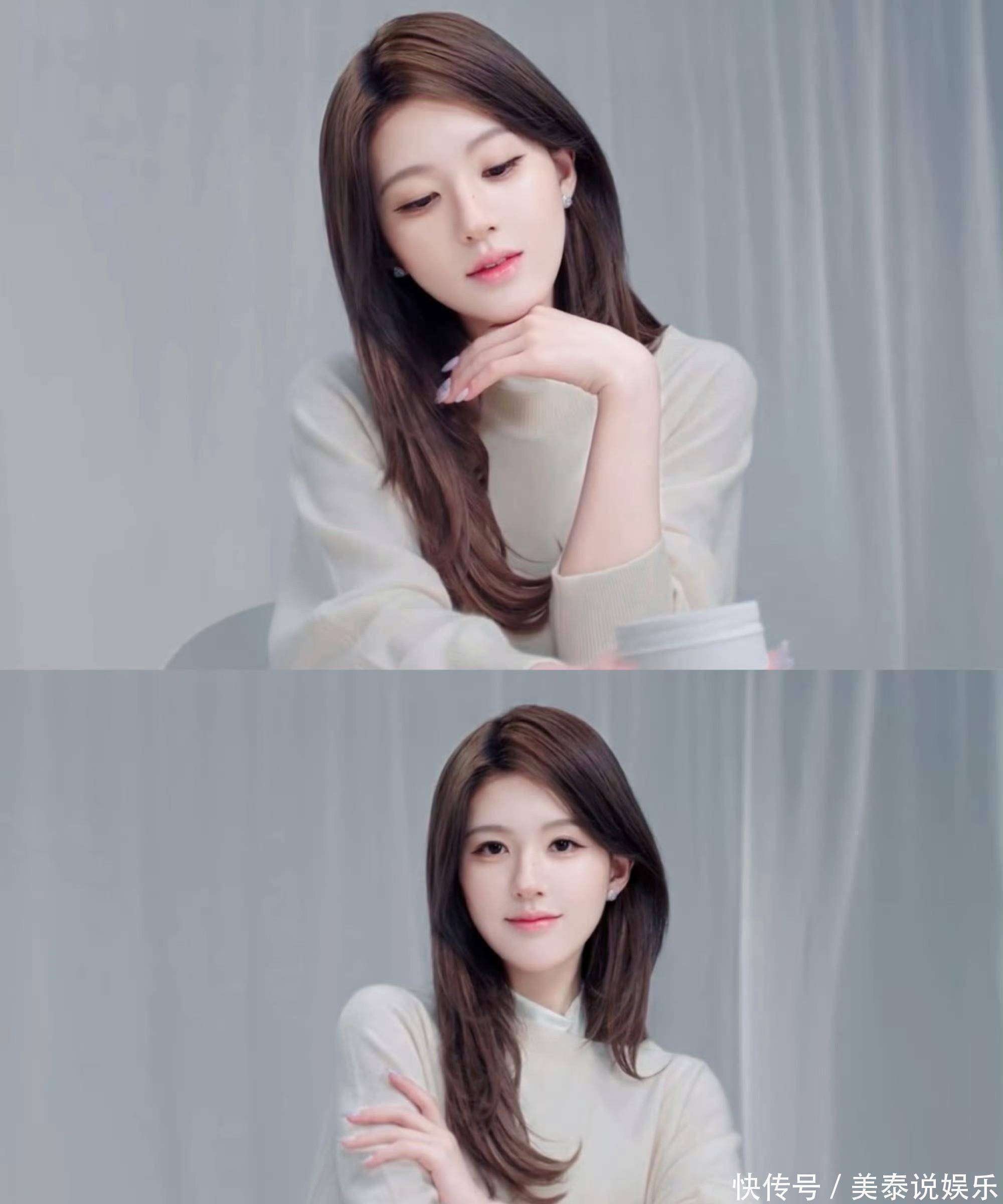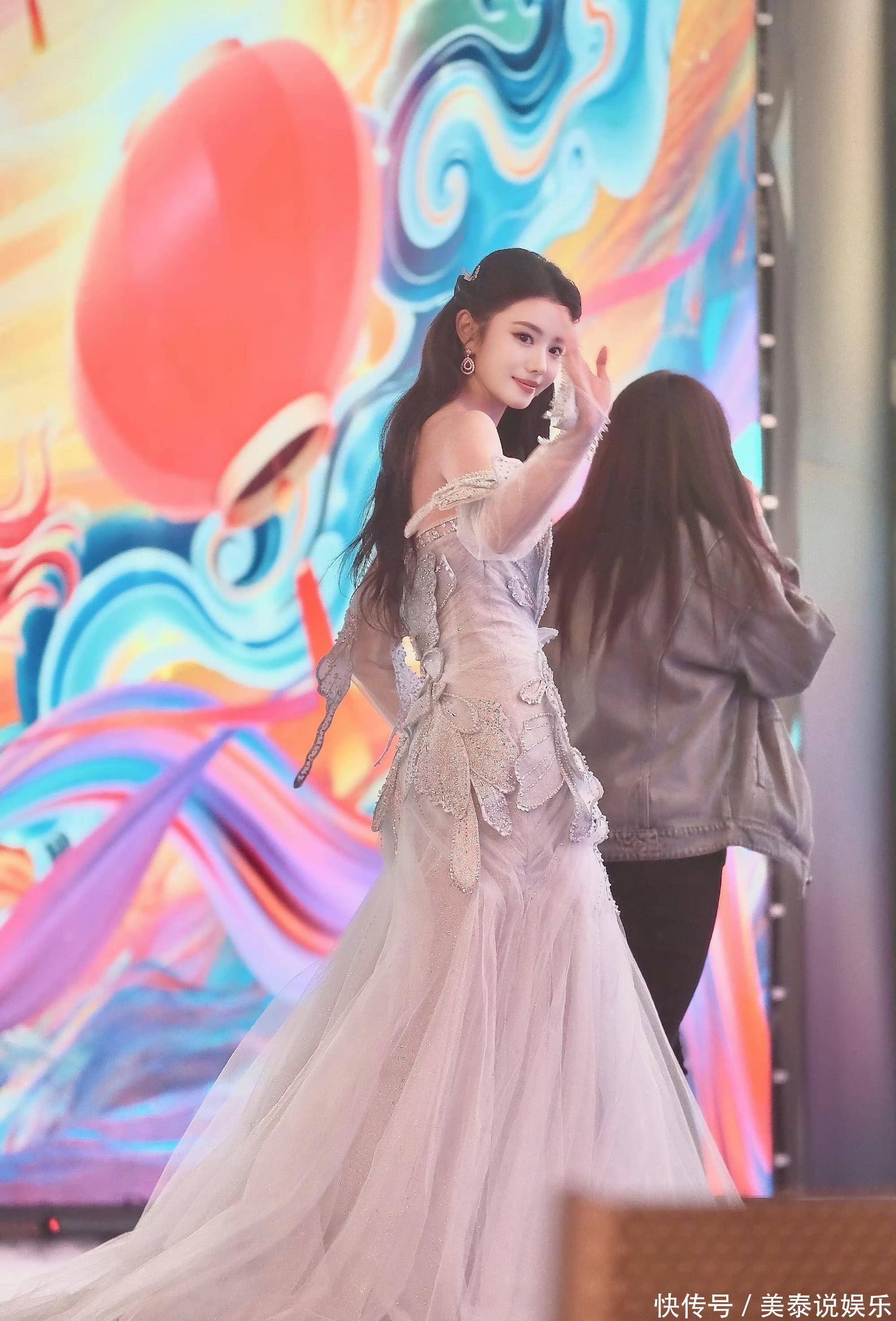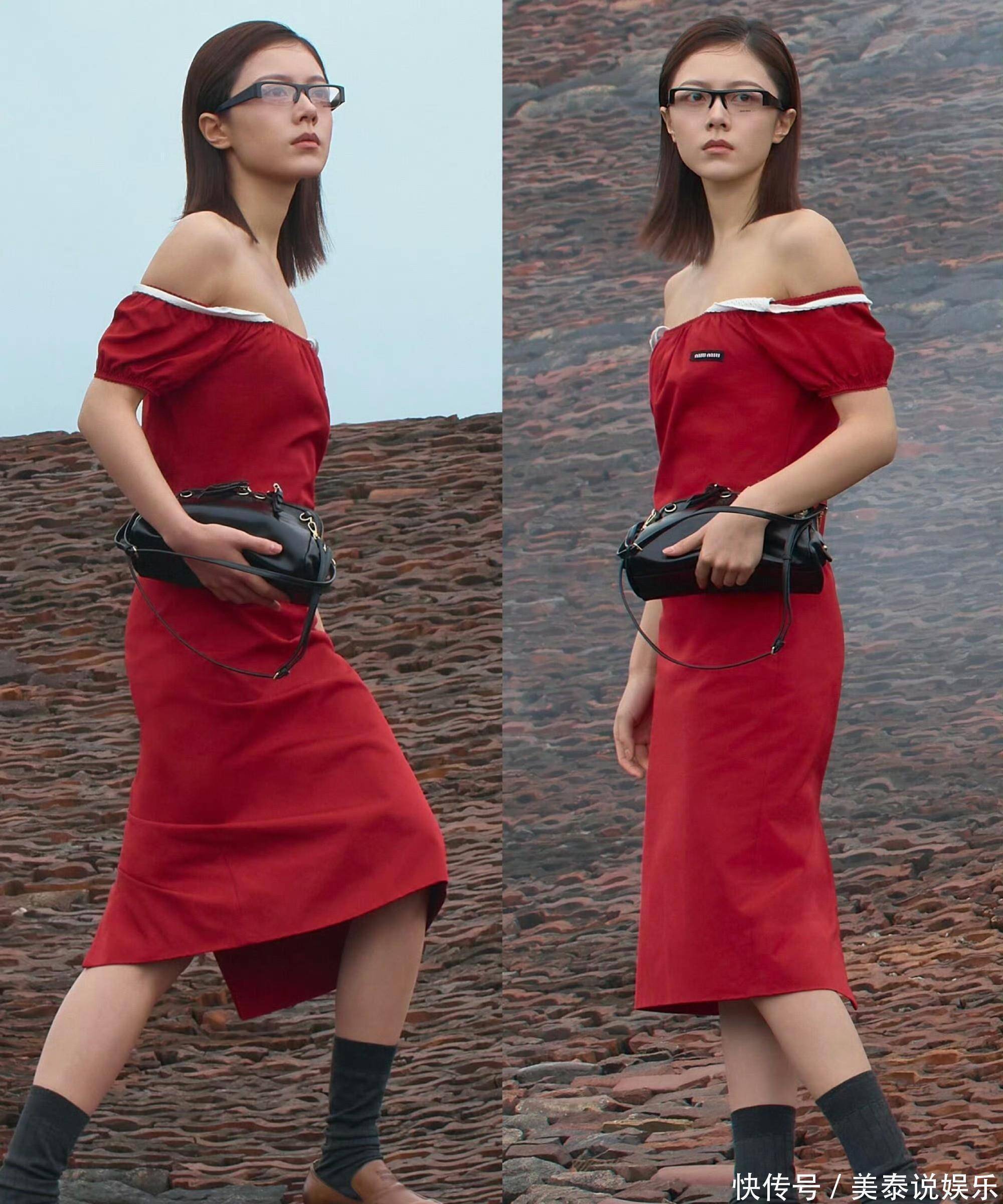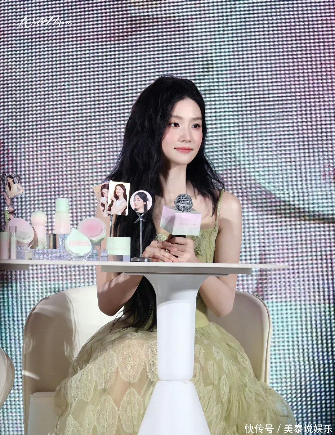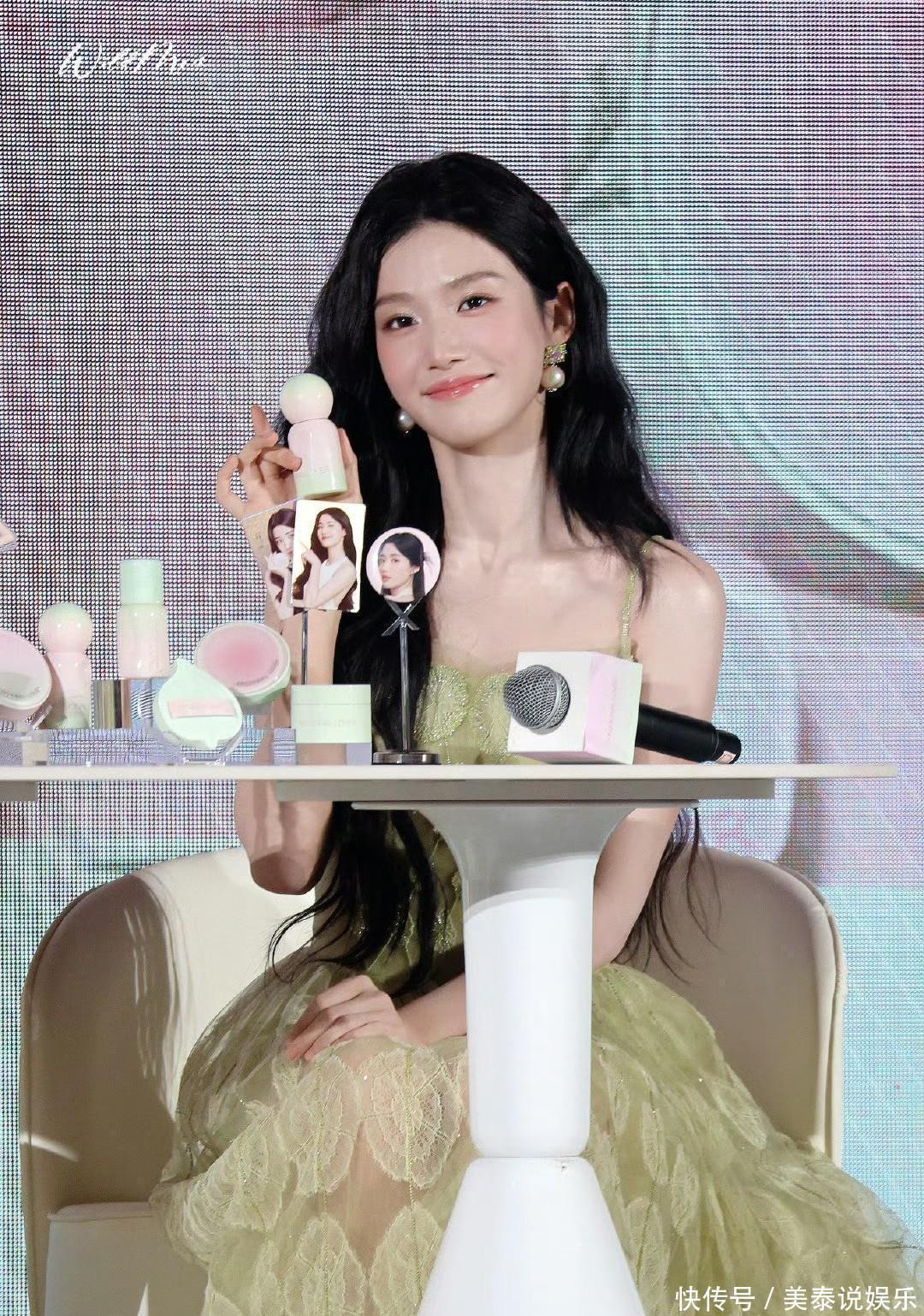 身着浅绿色细肩带纱裙,眇小薄纱材质随风飞舞,搭配微卷长发,举座呈现灵动仙气。