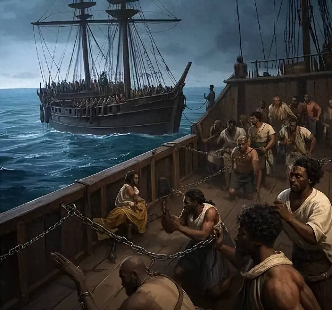 这些黑东谈主本来在我方的家乡种着地、打着猎,可能前一秒还在和家东谈主吃着木薯,后一秒就被出其不备的绳子套住了脖子。那些当地的部落领袖为了换取欧洲东谈主的朗姆酒,不吝发动干戈去抓捕邻居。这些厄运蛋被串成一串,像蚂蚱相似被牵到海边。当他们第一次看到那万千景色的大海和精深的风帆时,内心充满了对未知的哀痛。他们合计这些白东谈主是食东谈主族,要把他们抓到海的那头煮了吃。 这种相配的思想包袱,从踏上跳板的那一刻起,就成了他们挥之不去的恶梦。