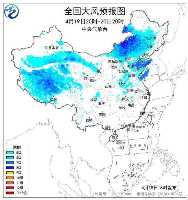 rrrr瞻望,4月18日20时至19日20时,新疆东北部和南疆盆地、内蒙古、黑龙江西部和东南部、吉林中西部、辽宁中西部、西藏西部和北部、青海北部、甘肃北部、宁夏、陕西中北部、山西、河北西北部和东南部、天津、山东西北部、河南西北部、贵州北部、重庆南部等地部分地区有5~7级风,阵风8~9级,其中新疆东北部和南疆盆地、内蒙古中西部、河北南部、河南西北部局地有8~9级风,阵风10级以上;渤海西部海域将有7~8级、阵风9级的大风。