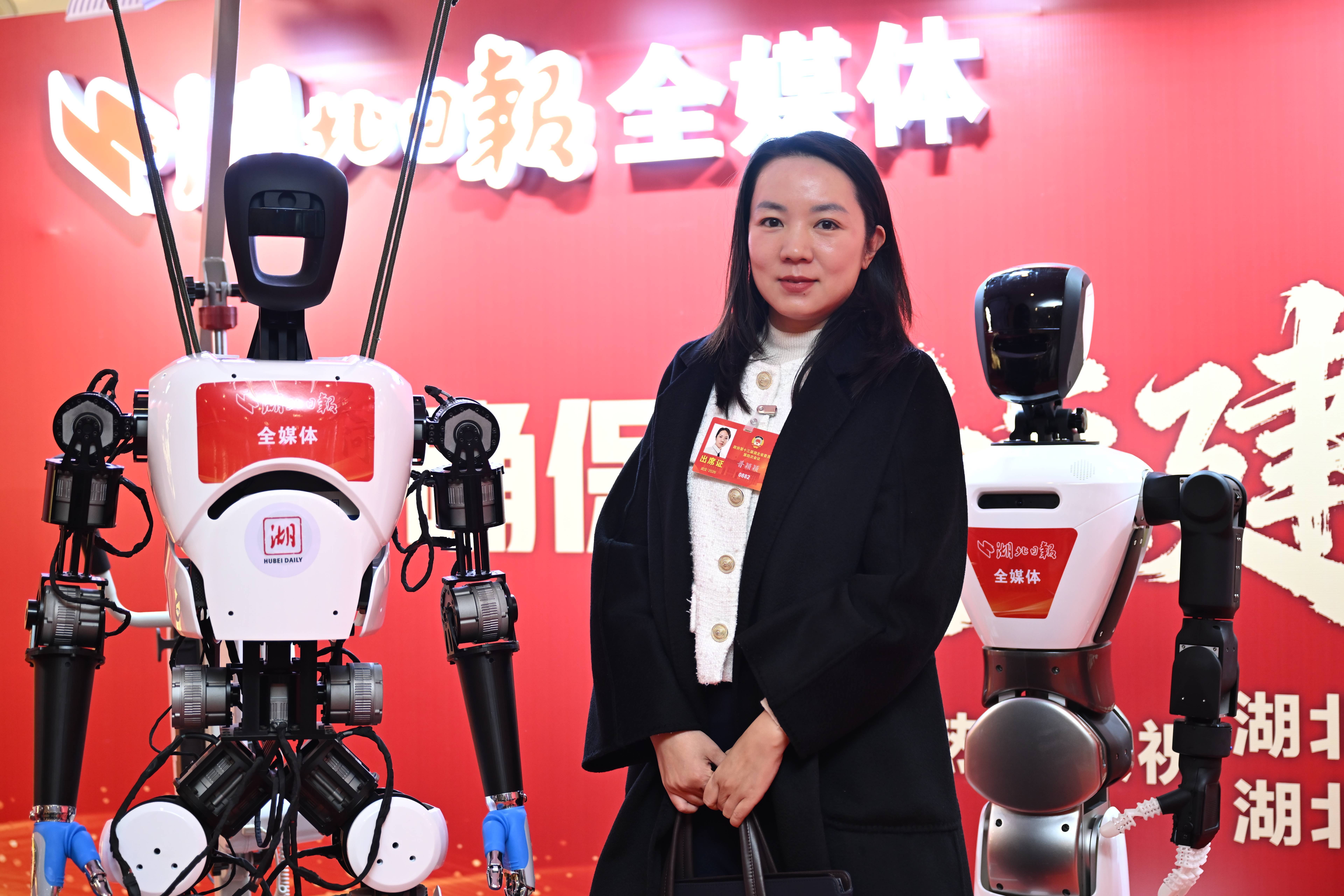 1月26日上昼,湖北省政协十三届四次会议在洪山会堂开幕,出席会议的委员们与湖北造机器东说念主“远游”“天问”互动、合影贪恋。(湖北日报全媒记者 喻煜 张灿 涂家骏)